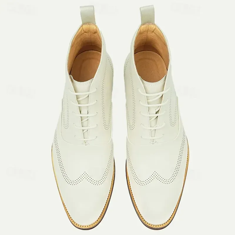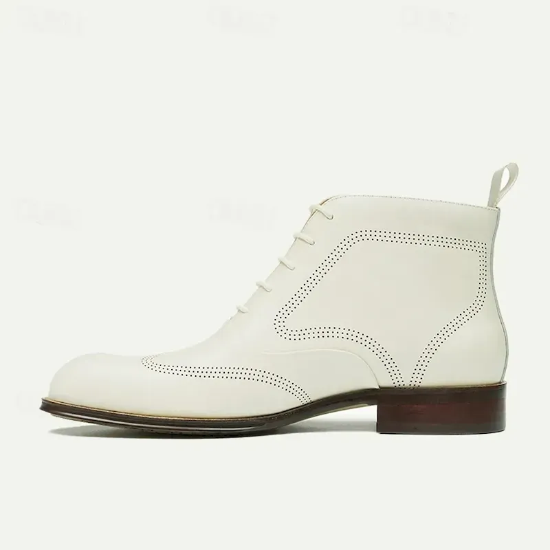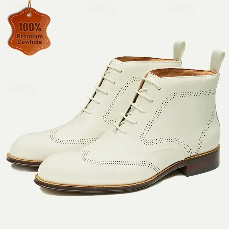 Men’s Premium Cowhide White Oxford Boots – Perforated Design, Business Formal Leather Ankle Boots 2025