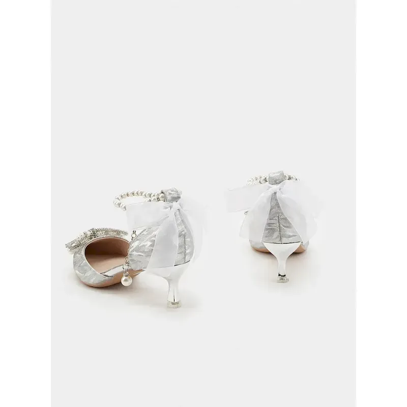 Silver Glitter Pointed-Toe Kitten Heels with Pearl Anklet and Bow Accents for Women – Stunning Wedding Shoes 2025