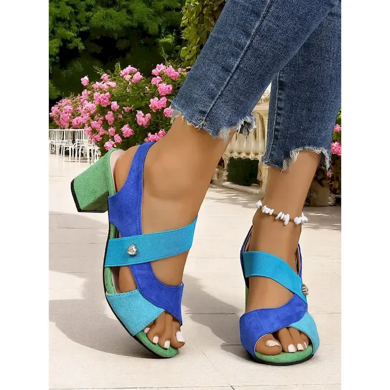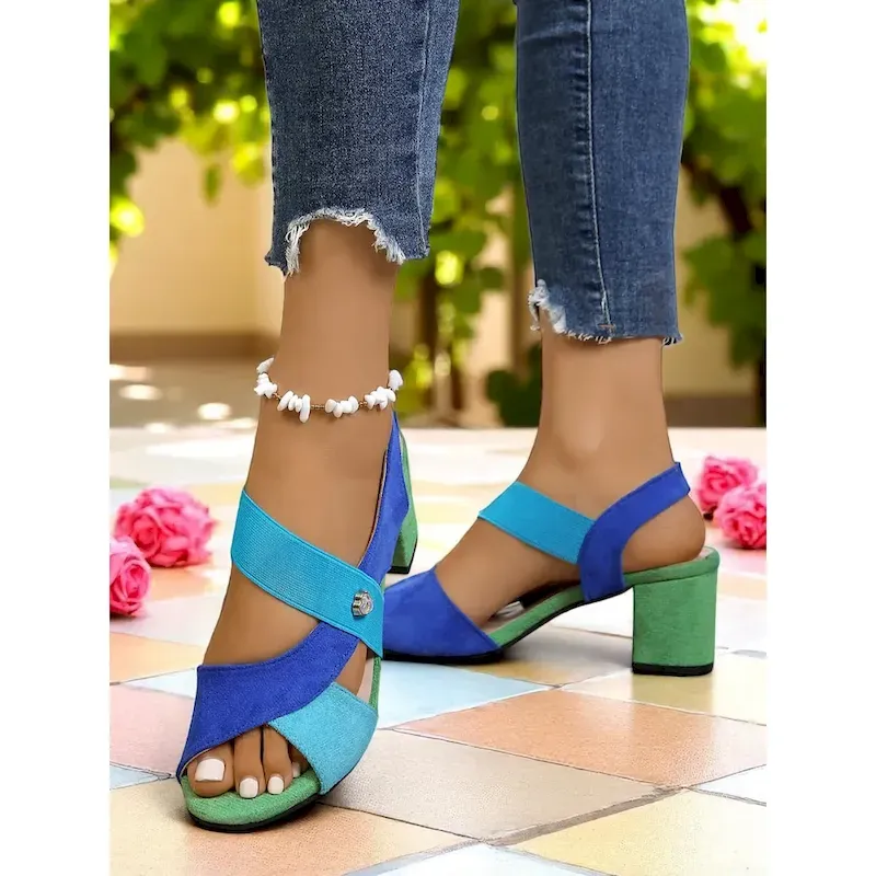 Women’s Colorblock Chunky Heel Sandals with Elastic Cross Straps, Artistic Retro Style for Summer Parties, Courtyard Events and Cruise Vacations 2025