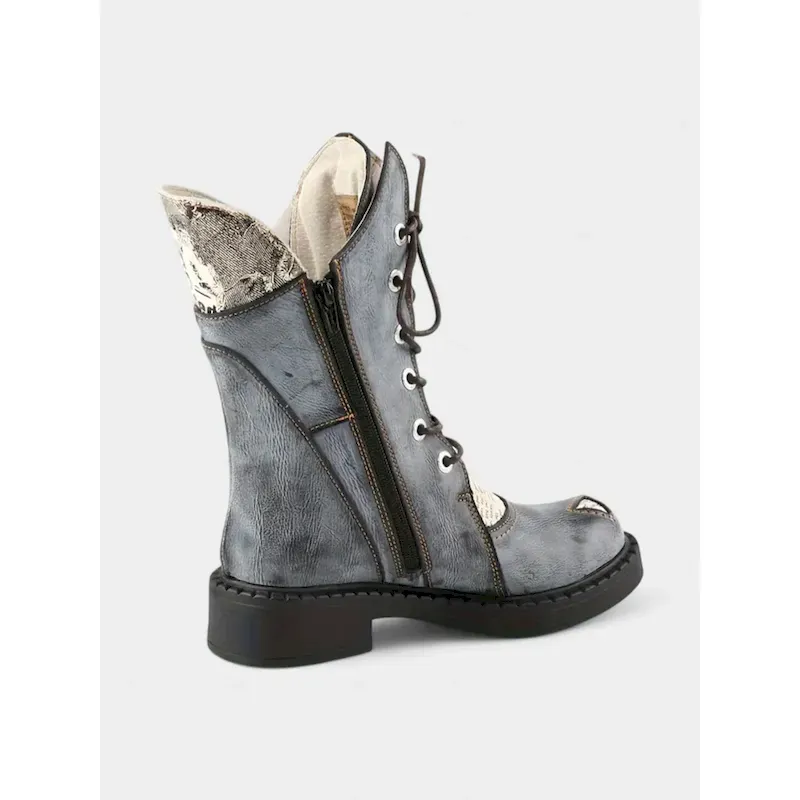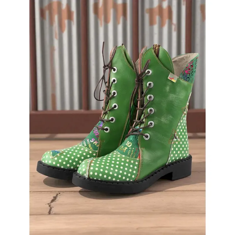 Women’s Genuine Leather Green Polka Dot Combat Boots – Retro Lace-Up Boots for Outdoor Fashion and Festivals 2025