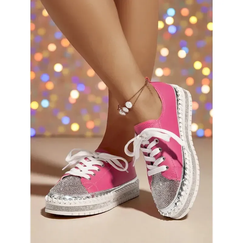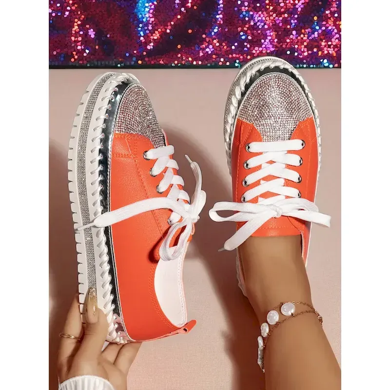 Women’s Orange Rhinestone Sneakers – Glitter Lace-Up Casual Party Shoes with Chunky Sole for Nightlife and Club Outfits 2025
